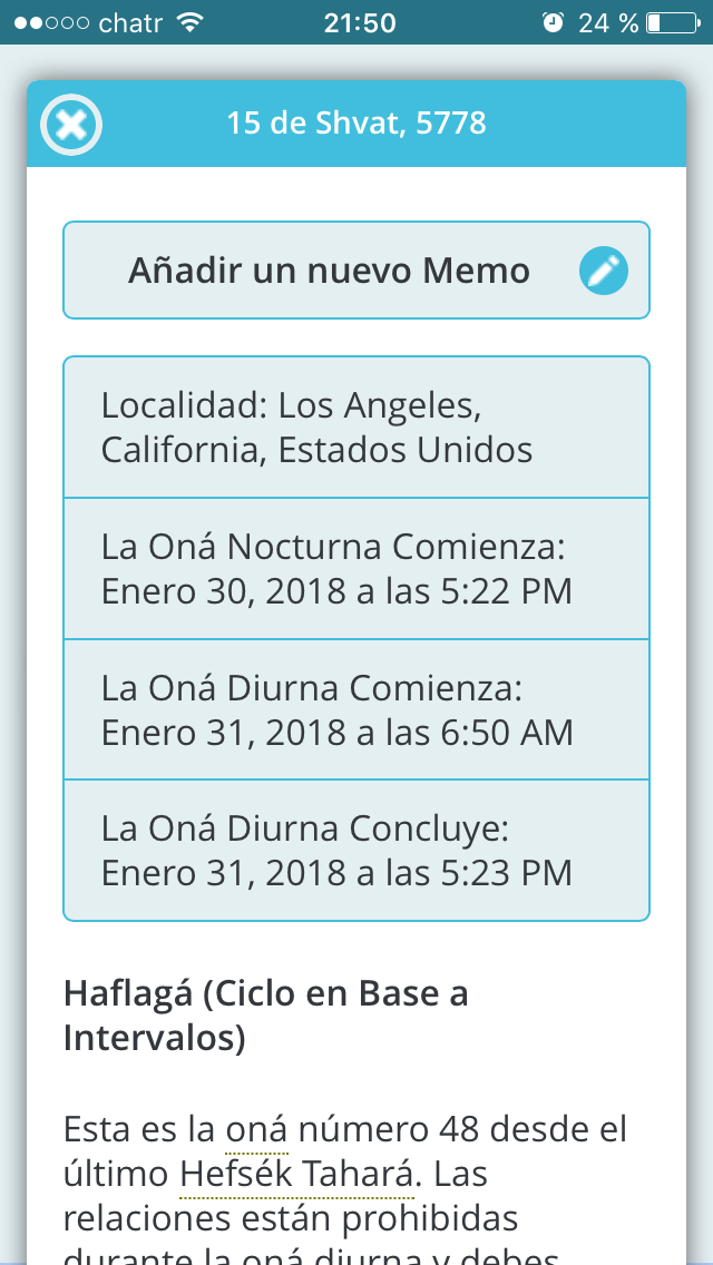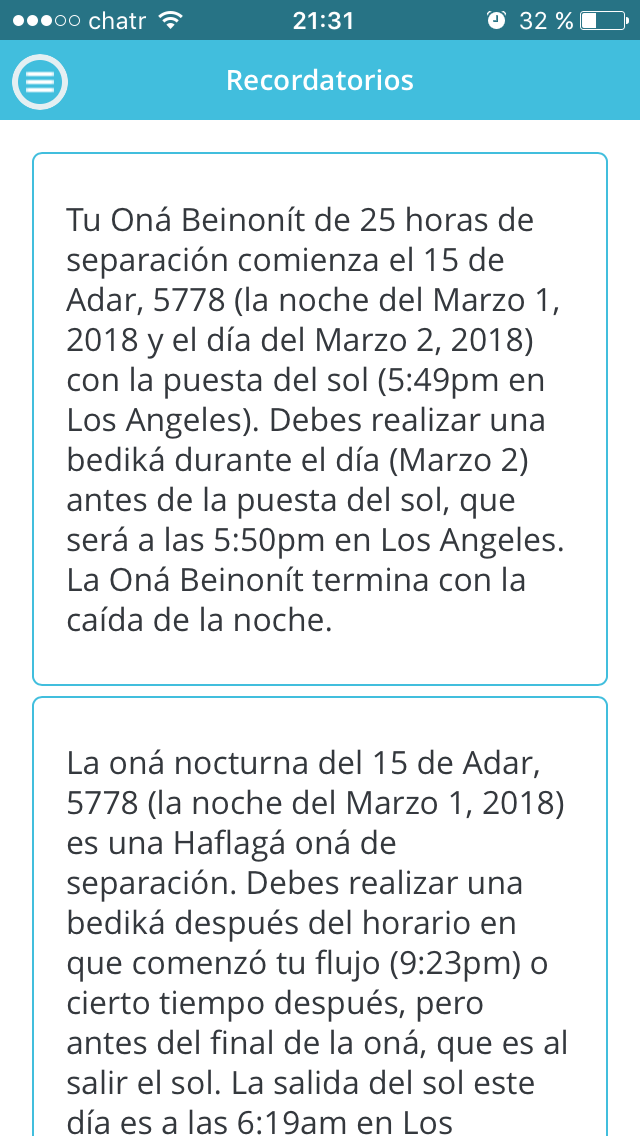 Tienes la opción de seleccionar Expicar Todos los Cálculos desde el menú de Configuración. Cuando lo hagas, ventanas emergentes explicarán cómo se llega a los resultados de todos los cálculos en cada paso de tu Calendario de Mikvé.