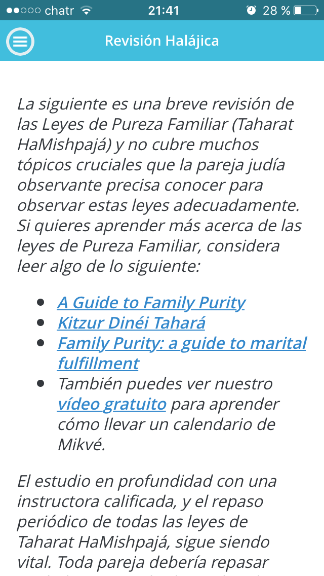 Mi Calendario de Mikvé fue desarrollado con la colaboración de los principales Rabinos mundiales en el campo de la Pureza Familair (Taharat HaMishpajá) y se perfecciona permanentemente con su orientación